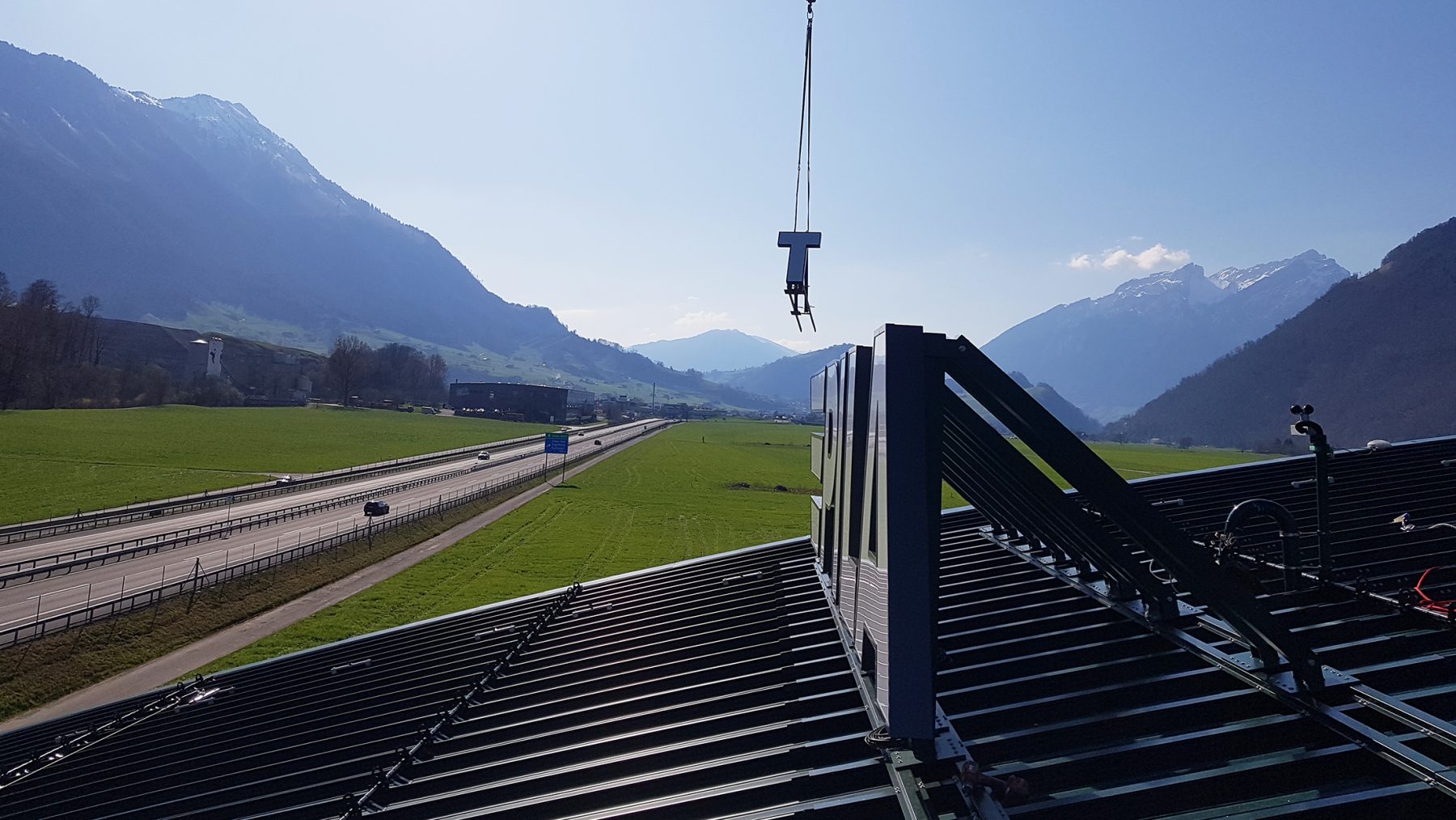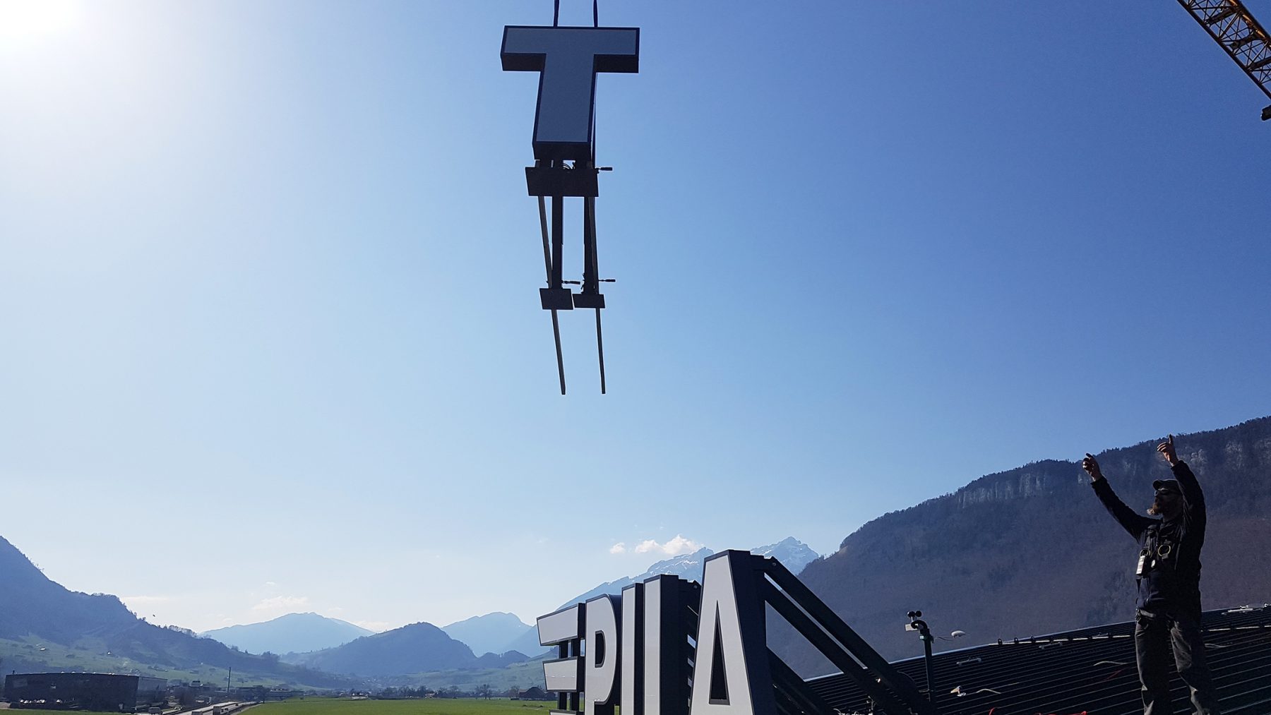 Um die Haut des konkaven Hallendachs nicht anbohren zu müssen, liessen wir die Buchstaben mit Stützen auf der Dachhaut montieren. Eine Herausforderung, die wir mithilfe spezieller Schlitten lösten, die wir eigens für die Montage konstruiert hatten.