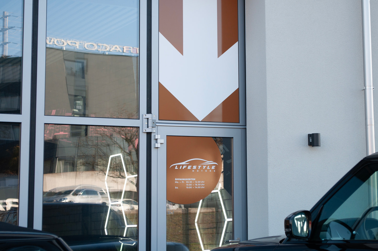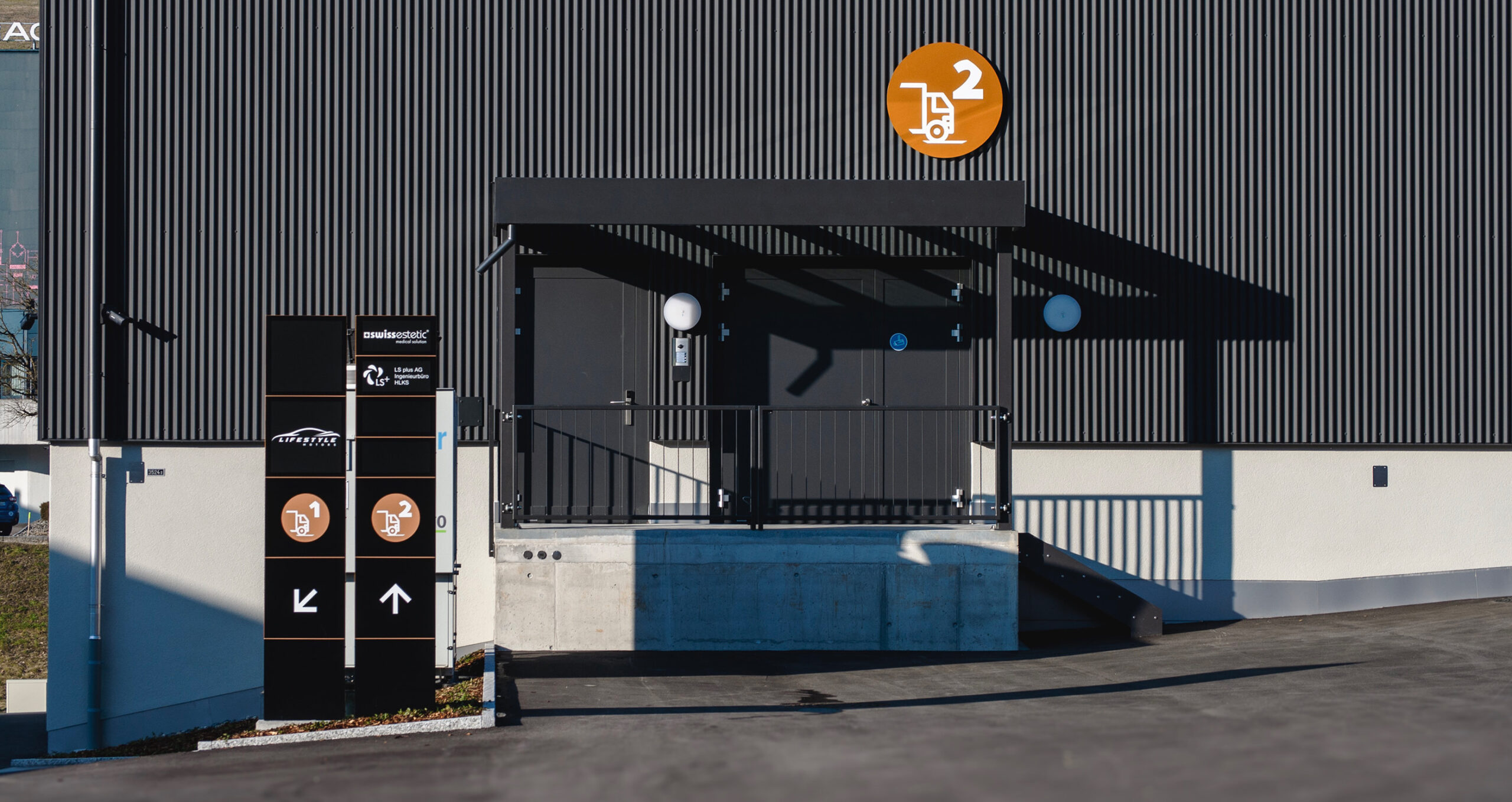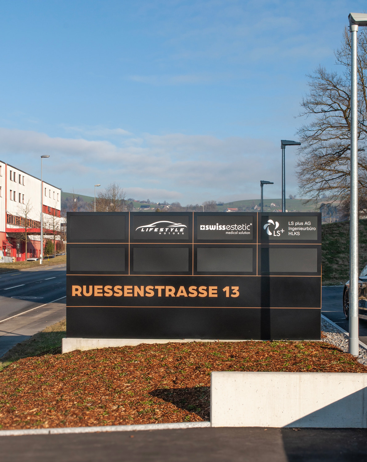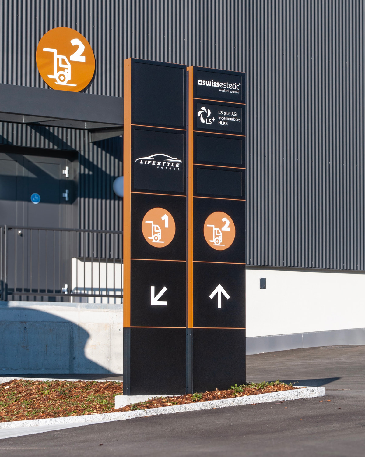 • Aussenbereich: Gebäudebeschriftung, Mieterschilder, Wegweiser und Pylone