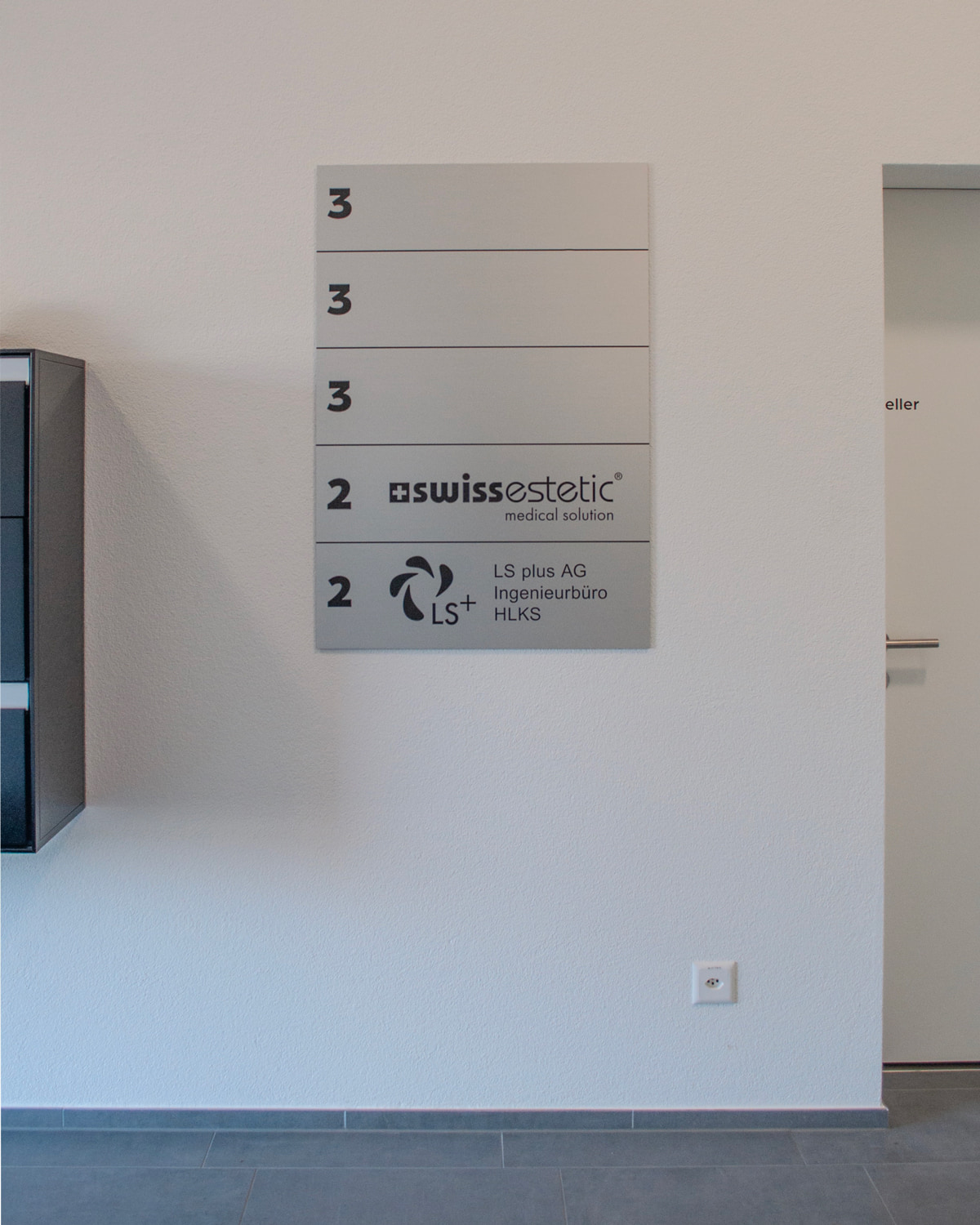 • Innenbereich: Tür- und Raumbeschriftungen, Stockwerkzahlen, WC- und Garderobenmarkierungen
