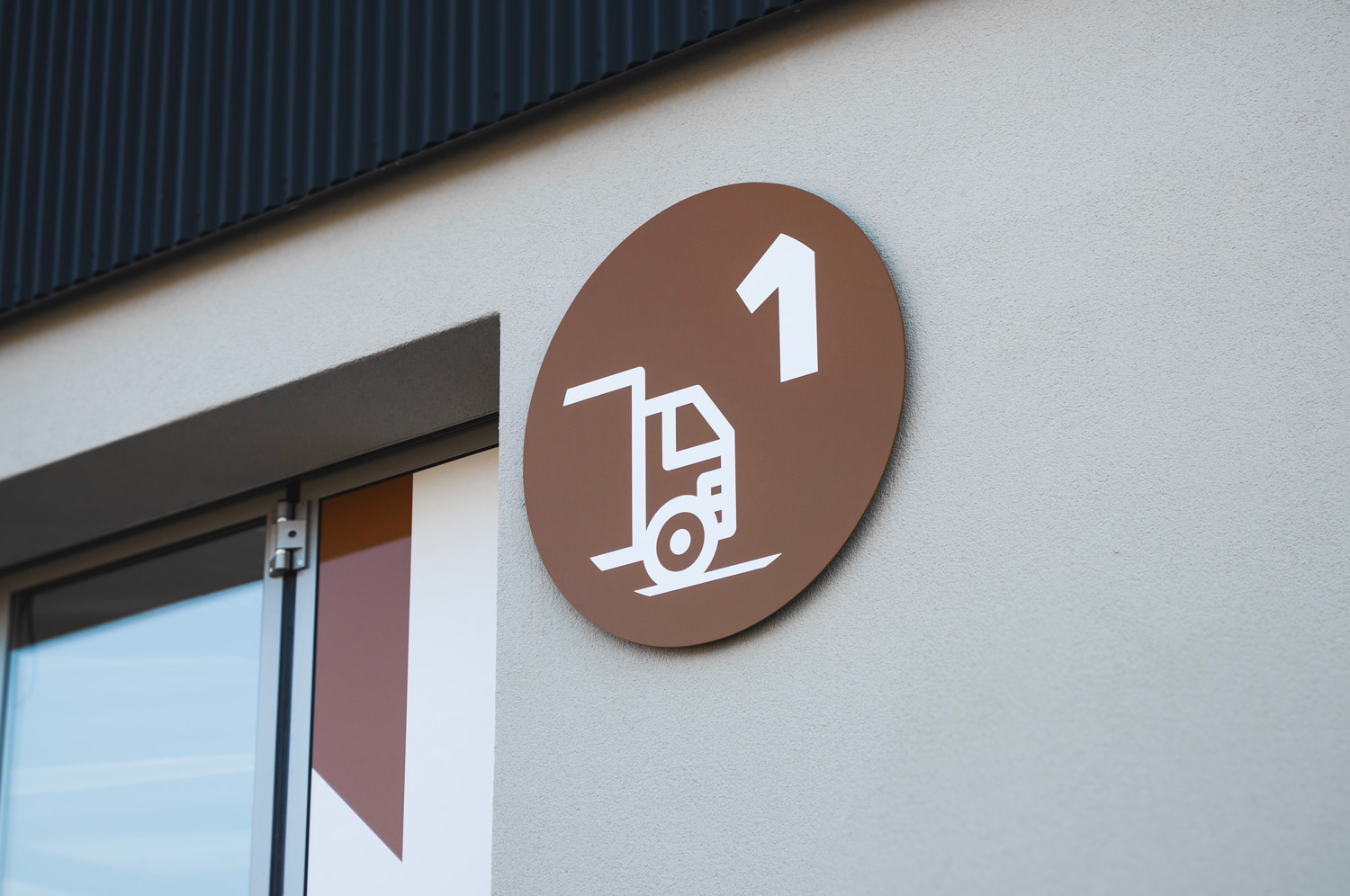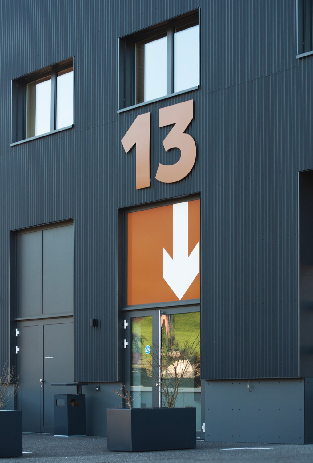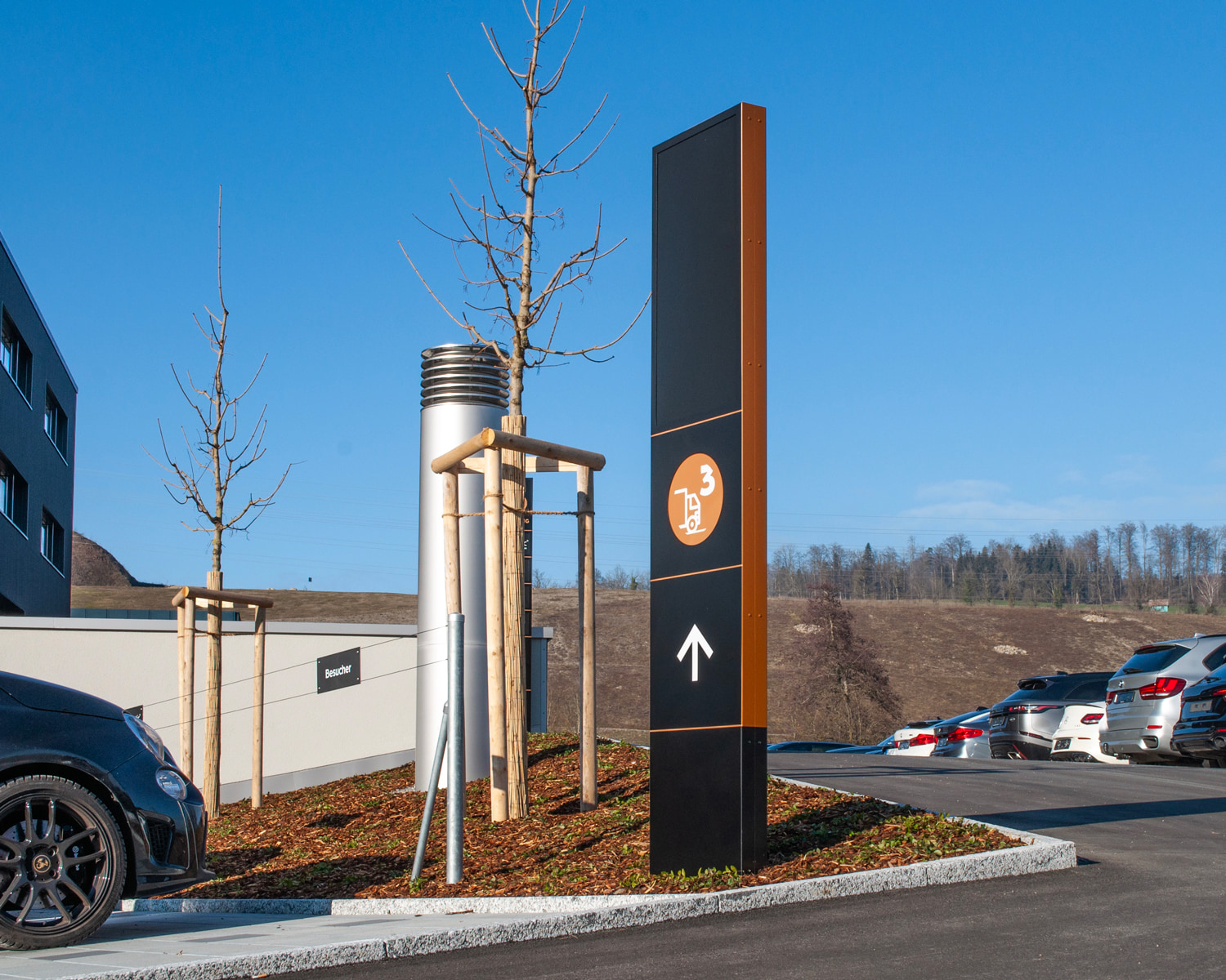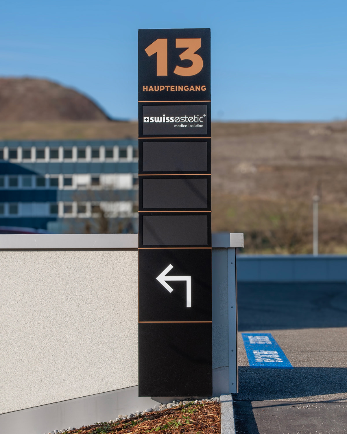 Das Gebäude kombiniert Beton, Holz und Stahl zu einem markanten Look. Die Signaletik sollte dieses Design unterstreichen, aber auch klare Orientierung bieten. Die Anforderungen waren hoch: langlebige Materialien, optimale Lesbarkeit und eine harmonische Integration in das architektonische Konzept.